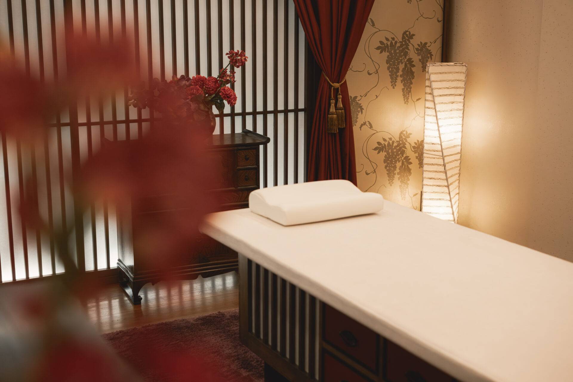 天井には鮮やかな和柄生地をパッチワークのように配し、施術ベッドに横たわったお客様の視界を華やかに彩ります。