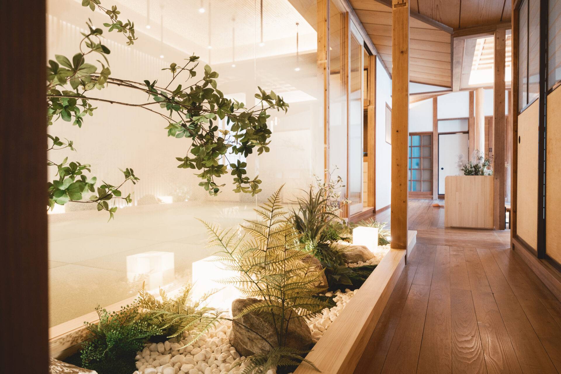 畳敷きの落ち着いた空間に、光と植栽が柔らかさを添え、心身を整えるヨガにふさわしい場を形成。